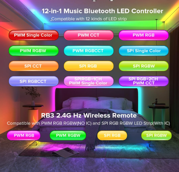 This remote control is compatible with various types of LED light strips, including both SPI addressable strips (like WS2811, WS2812B, WS2813, WS2815, SK6812) and PWM strips (4CH RGB, 5CH RGBW LED strips).